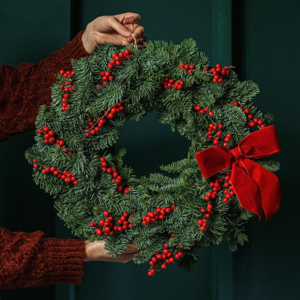 Такой декор обычно вешают на двери и стены, но он прекрасно подойдут и в качестве обрамления для низа праздничного дерева. Ведь для этого у него идеальная форма – овал или круг с отверстием посередине.